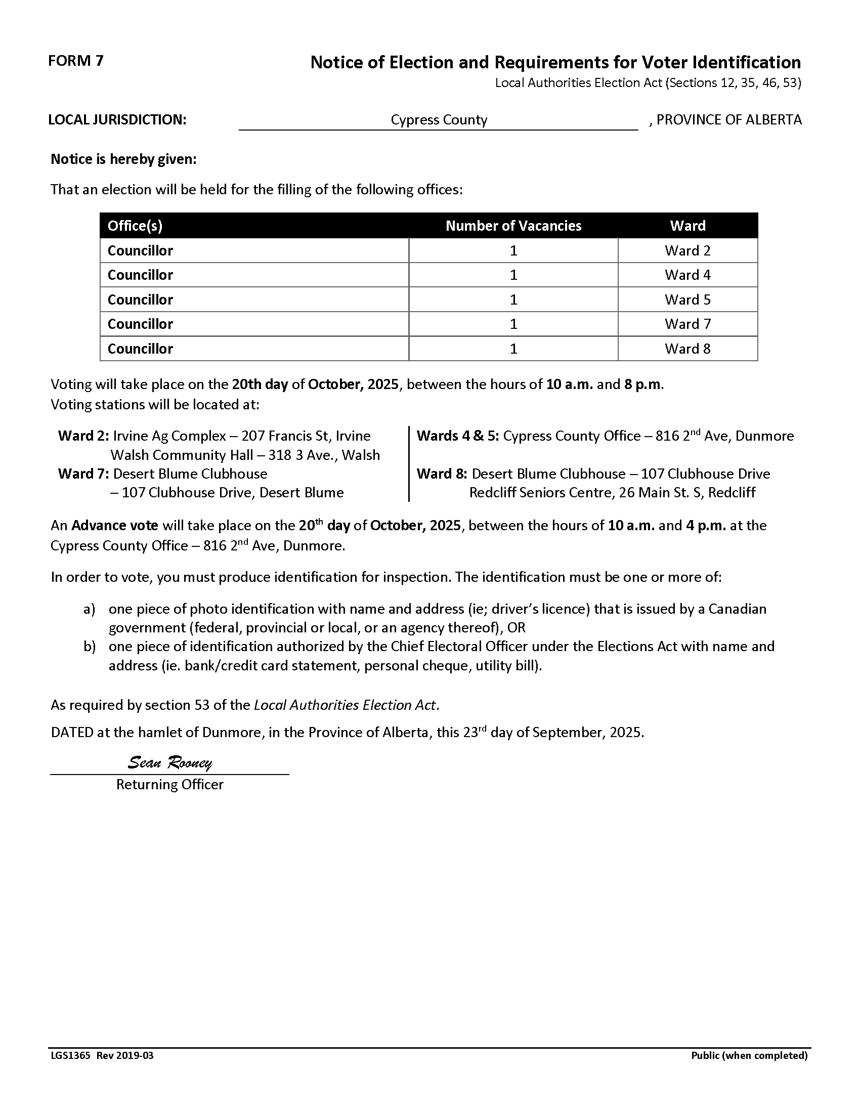 - To file your nomination in-person, please contact the Cypress County office at (403) 526-2888 or info@cypress.ab.ca to make an appointment with the Returning Officer.